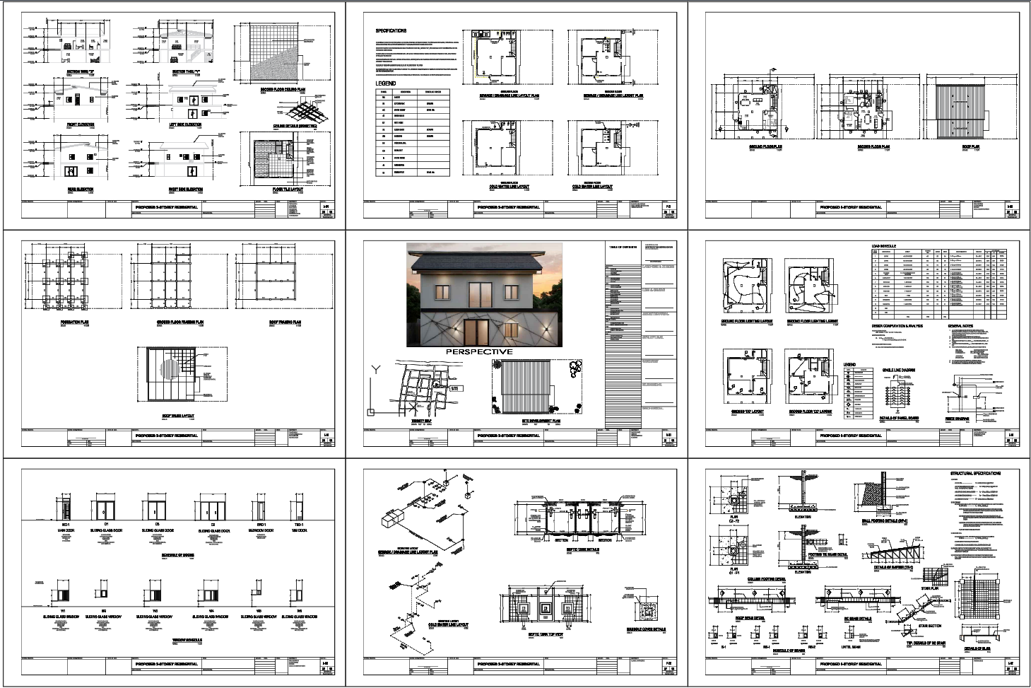 This AutoCAD DWG file provides a full two-storey residential building plan, offering detailed architectural drawings essential for design, analysis, and construction execution. The layout includes complete ground and second-floor plans, sectional drawings, roof framing layout, slab plan, column grid arrangement, and floor tile layout. The included elevations clearly display façade proportions, window placements, sill heights, and structural alignment across both levels. The file also features a comprehensive window and door schedule, sliding window details, fixed glass panel details, and material specifications that support precise quantity estimation and drafting accuracy. A rendered perspective view further enhances project visualization, enabling architects and designers to present concepts professionally.