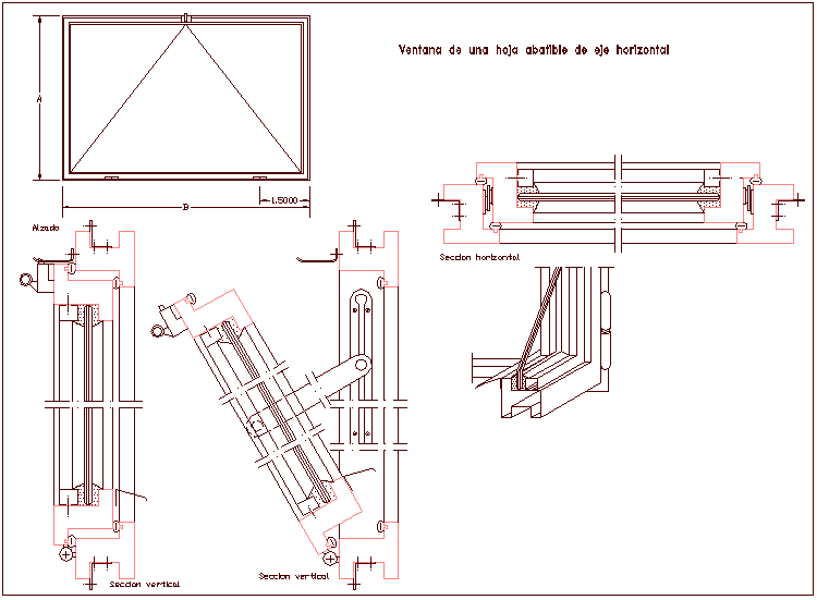 Horizontal axis folding leaf window with sectional view dwg file with view of window with dimension and sectional view in horizontal and vertical position with hinge view of window.