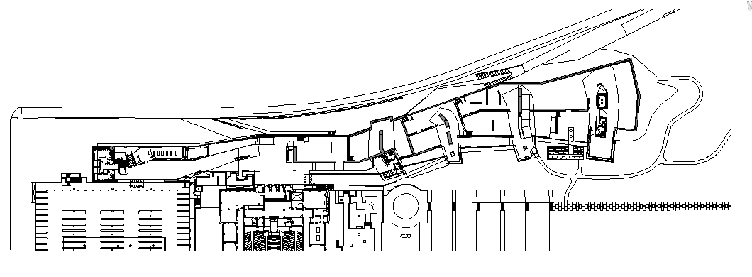 Office Layout plan with entry lobby, wall structure, doors and window elevation view, detailed toilets view, circular way entry gate, column and beams, stairs and much more of office design elevation plan.