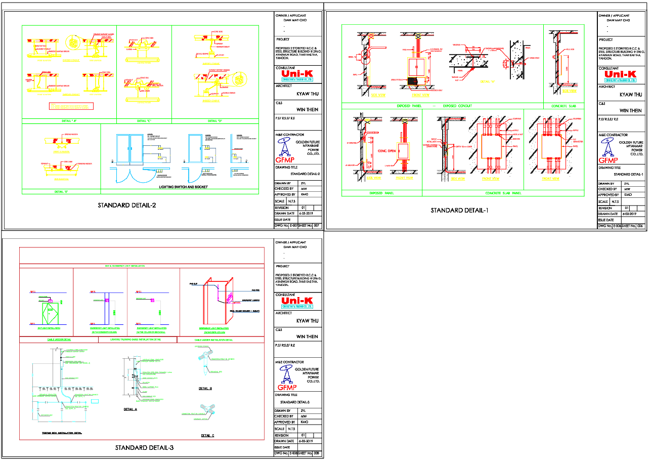 This AutoCAD DWG file provides comprehensive standard electrical installation details prepared for residential and commercial building projects. The drawing includes multiple standard sections illustrating lighting switch details, socket outlet installations, exposed and concealed conduit arrangements, panel fixing details, and wall-mounted electrical box configurations. Each detail is presented with clear sectional views, elevations, and fixing methods to ensure correct execution on site. Dimensions, mounting heights, conduit routing, and fixing points are clearly indicated to maintain installation accuracy and electrical safety standards.