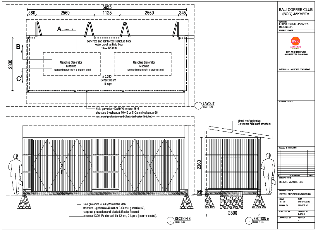 This AutoCAD drawing presents a detailed waste bin structure layout prepared for a commercial facility project. The drawing includes a complete plan layout showing overall dimensions, internal clearance, and placement of gasoline generator machines within the enclosure. Floor construction details such as reinforced concrete slab thickness, waterproof and anti-slip finish, and level markings are clearly specified. Elevation views illustrate the external enclosure form, metal grill arrangement, access opening, and roof profile with a galvanized mild steel structure. These drawings are developed under Architecture documentation and are suitable for site coordination and approval reference in commercial developments such as cafés and service facilities.