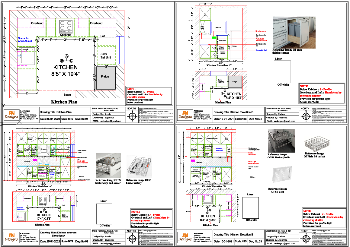 The drawing also includes multiple kitchen elevations illustrating shutter alignment, cabinet heights, basket placement, and internal accessories such as SS baskets, cutlery units, cup and saucer holders, and vent positioning. Notes specify material finishes, handle profiles, and lighting provisions below overhead cabinets. These details assist in fabrication accuracy and on-site installation coordination. The drawing supports reference work for Interior Design projects and is useful for execution documentation related to Residential Interior, ensuring clarity between design intent and site implementation.
