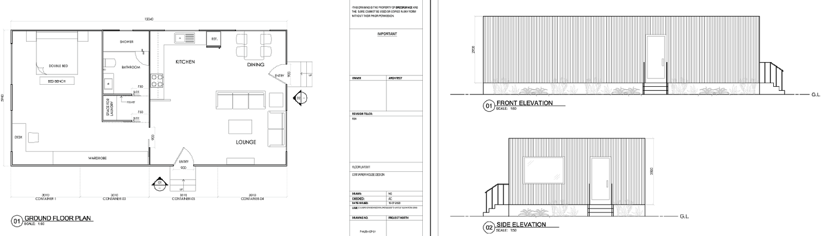 The drawing also includes exterior building views to explain overall form, access steps, and opening locations. Dimensional references, ground-level marking, and elevation alignment assist in understanding how the structure sits on site. From a detailing perspective, the drawing supports execution requirements aligned with Construction Detail Drawings, helping professionals interpret layout relationships and external features accurately. The file provides a clear visual reference for space planning, layout coordination, and residential design documentation using container-based construction concepts.