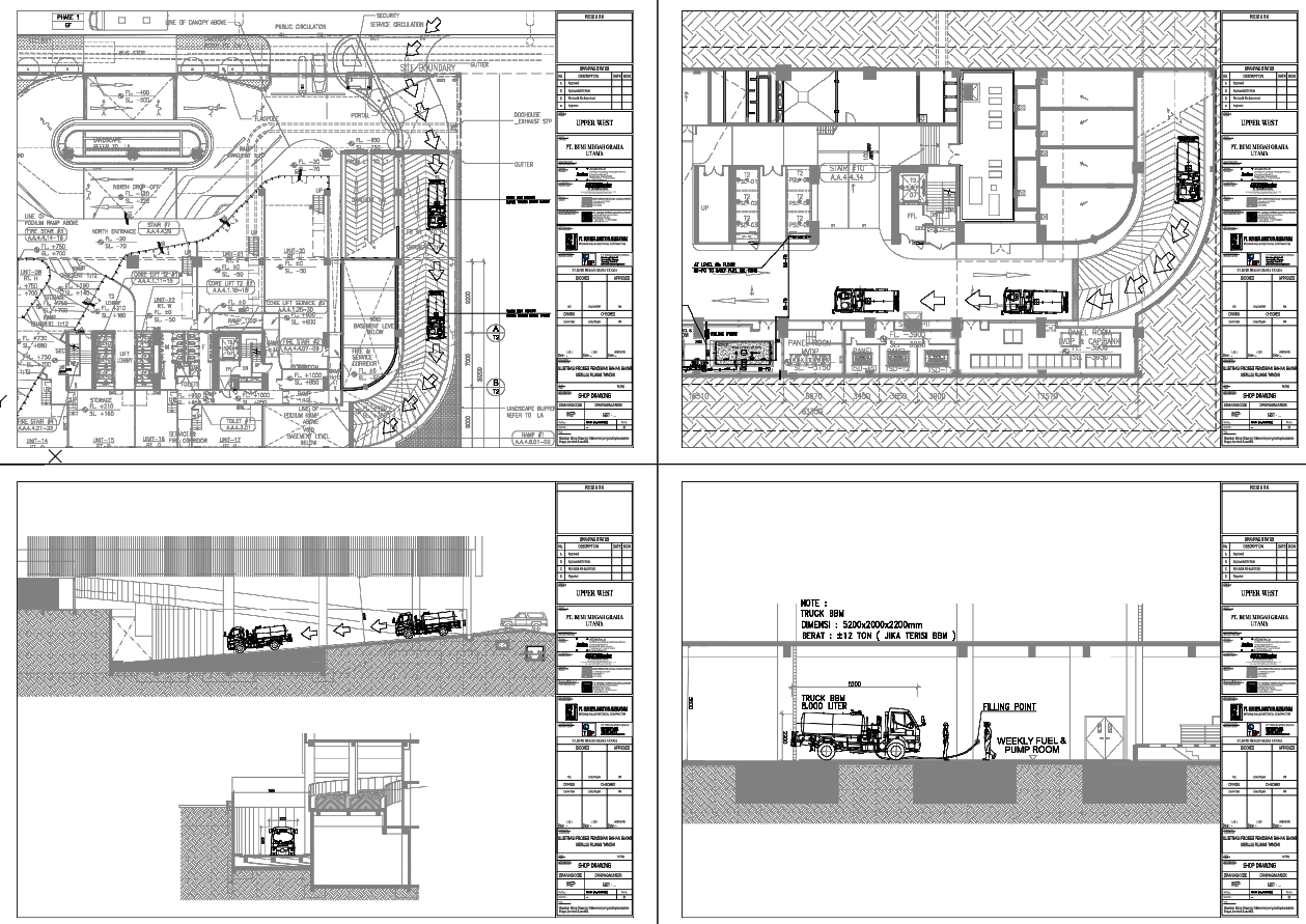 The file also includes detailed ramp sections and elevation drawings, illustrating slope gradients, level transitions, and vertical clearance required for truck movement. Standard truck dimensions are shown to verify ramp usability, headroom safety, and maneuvering efficiency. Structural elements such as retaining walls, floor levels, and boundary conditions are clearly indicated to support construction coordination. This AutoCAD DWG file is ideal for architectural planning projects related to architecture, Roads and Bridges, and construction details. The editable CAD format allows easy modification and seamless integration into larger design and execution drawings.