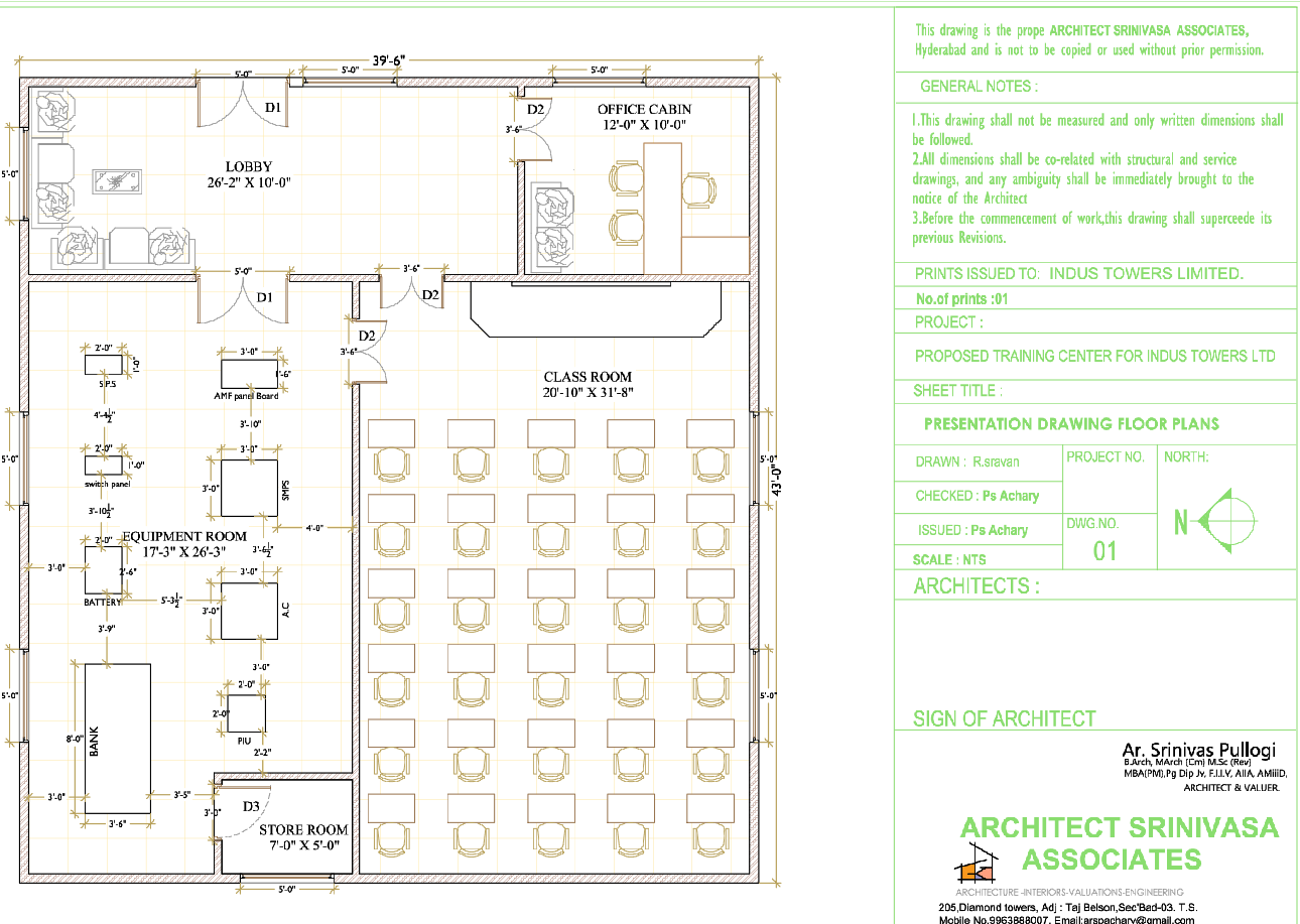 This drawing presents a detailed floor layout plan prepared for a training center facility with clear spatial planning and functional zoning. The layout includes a classroom area with an organized seating arrangement, a lobby space for entry circulation, an office cabin for administrative use, and supporting rooms for equipment and storage. Written dimensions are clearly marked for each space, ensuring accurate planning and coordination during design development. The layout supports architectural planning workflows and is suitable for professional use within architecture-related projects. Spatial clarity and layout organization help architects understand movement flow and room relationships within institutional planning contexts.