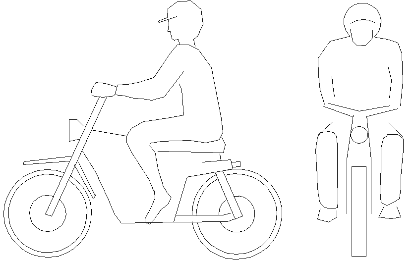 This AutoCAD DWG file presents a detailed 2D CAD drawing of a man with a motorcycle, illustrated in both side and front views. The figure is proportionally drawn to represent an accurate scale and human posture while riding a motorcycle. The clean and precise linework enhances the clarity of the mechanical and human forms, making it ideal for transportation, urban design, or traffic-related architectural projects. This drawing can be efficiently used in plan presentations, technical layouts, and visualization documents to convey real-life activity within a design.