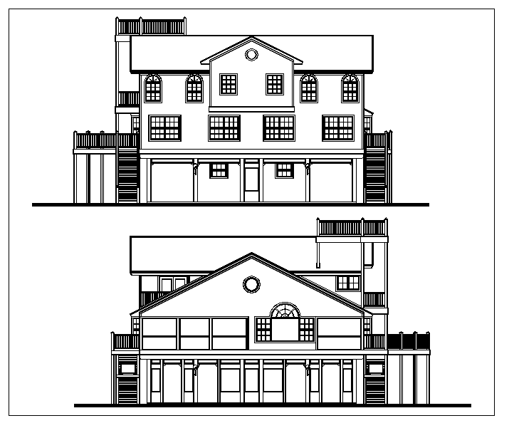 Elevation o bungalow with 3 floors exterior elevation of front and rear..showing walls ceiling doors staircase flowerbeds wood frame floor to ceiling exterior.