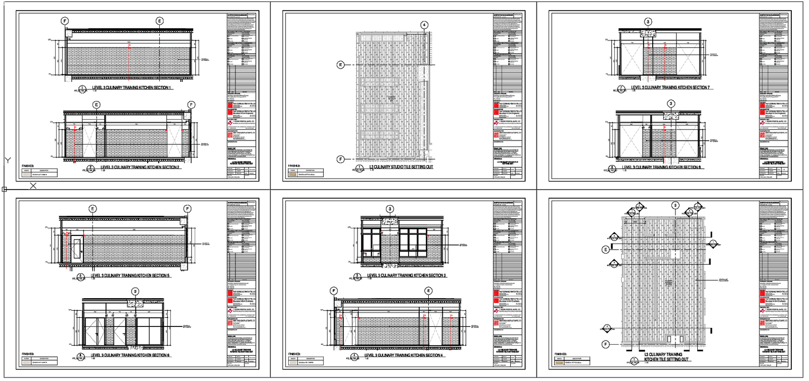 This AutoCAD drawing illustrates detailed Level 3 culinary training kitchen section views, along with tile setting out information prepared for professional architectural and construction use. The sheet includes multiple sectional drawings labeled Section 1 to Section 8, clearly showing wall buildup, brick patterns, finishes, window positions, door openings, lintel levels, slab thicknesses, and ceiling details. Horizontal and vertical dimensions are accurately marked to support execution, including floor to lintel heights, sill levels, parapet alignment, and structural junctions. The kitchen sections present consistent layout coordination with clear references between grid lines and section markers for site clarity.