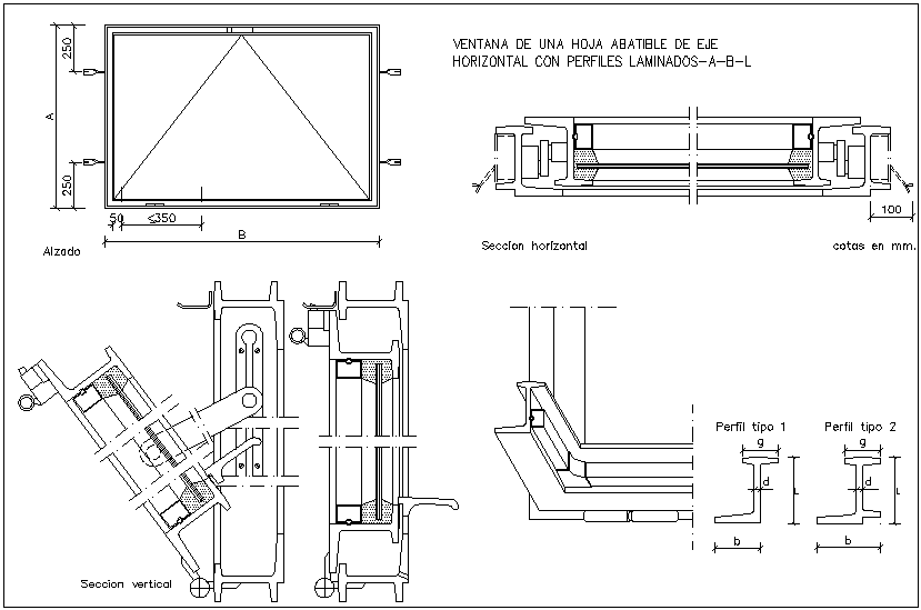 Window view of folding axle leaf with laminated profile with section view dwg file with