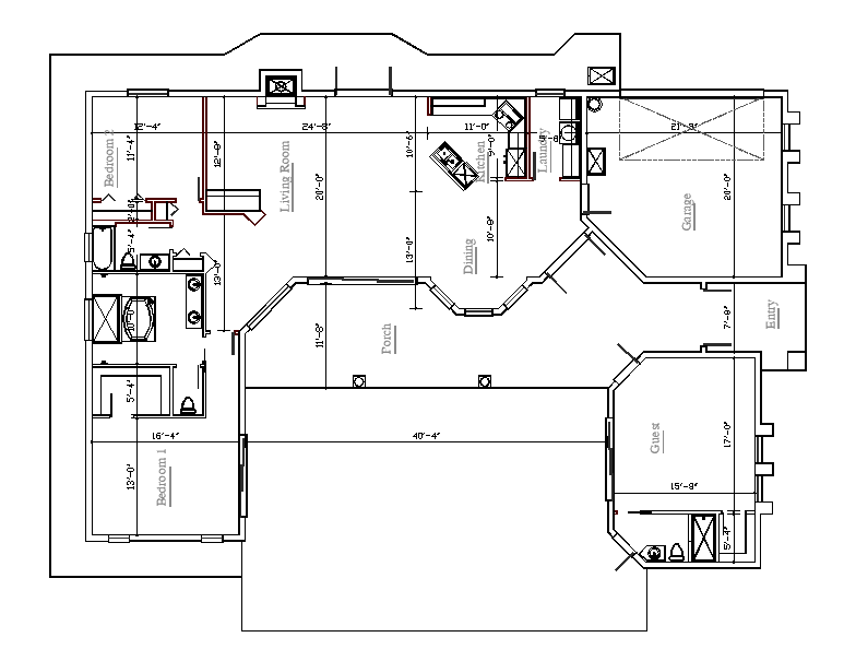 Layout plan of house showing detailed dimension and kitchen living room,2 bed rooms porch laundry dining guest room entry and garage.