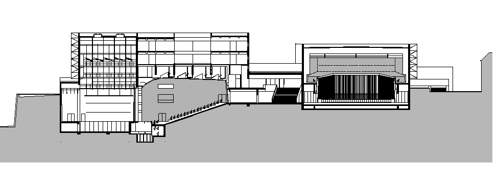 Multipurpose Arcade Elevation plan that include wide entrance stair cases, glass windows, door view, roof view, footing details, wall construction, beam construction, column construction, indoor stair cases and much more of arcade design.