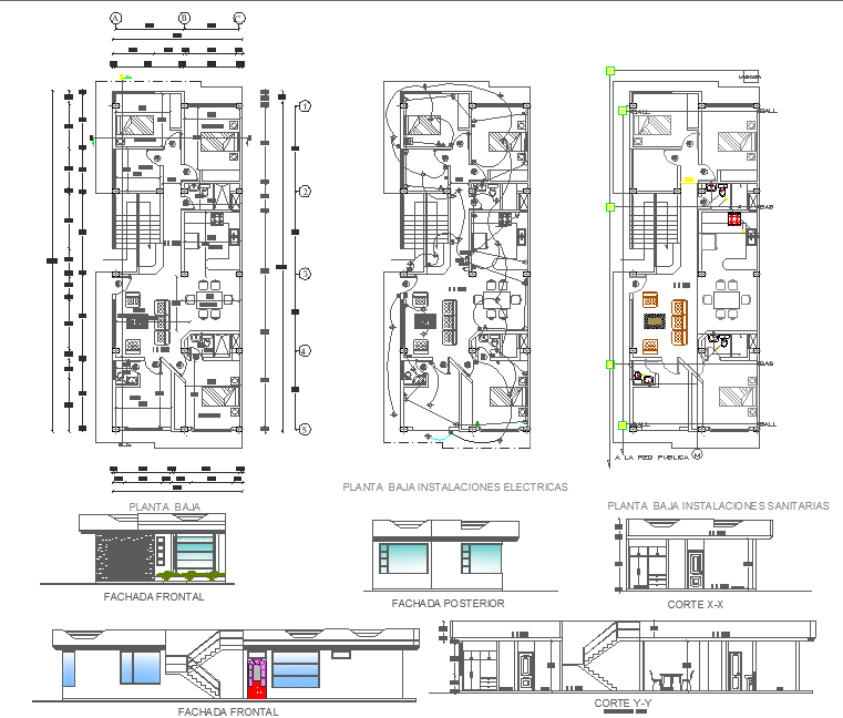 Elevation of House includes plan with 3 bedrooms living room kitchen dining bathroom wc..and interior elevation of bedroom dining with dimensions and also exterior elevation showing parking stairs doors windows parking and terrace.