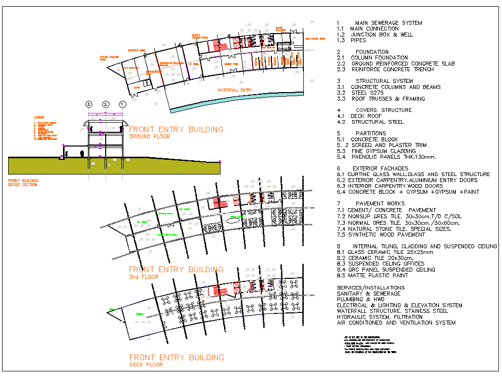 Find here 3 level layout plan along with furniture detail, structure plan, construction plan, section plan and have the detail of brief description for the restaurant project.