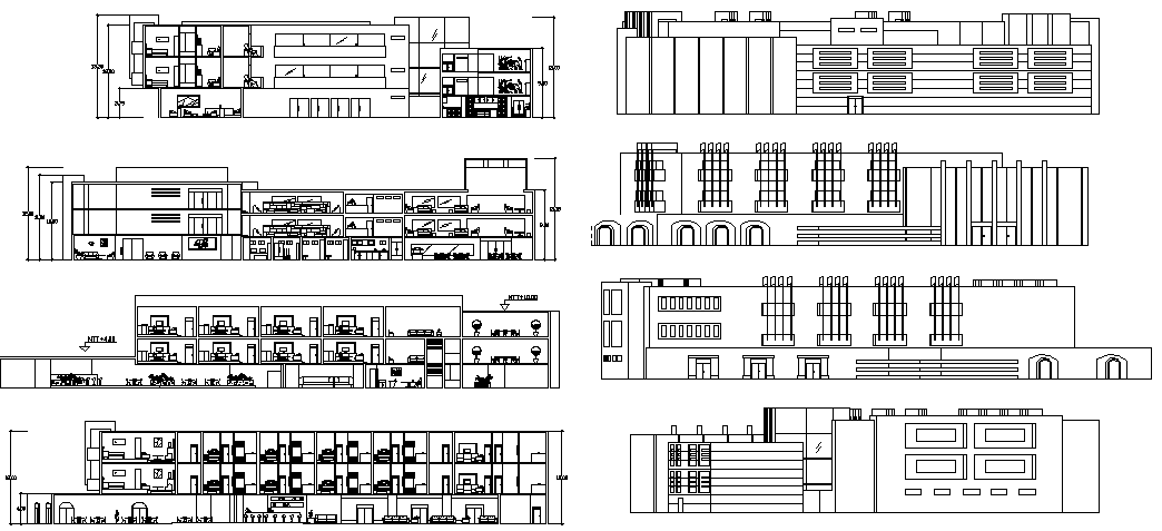 Hotel Design and Elevation Plan that includes front, back and side view, entry gate, lobby, car parking, reception area, waiting area, dinning area, cafeteria, stairs details, dinning hall, kitchen, doors and window elevation, bedroom elevation, terrace cafeteria, bar, balcony and much more of hotel design.