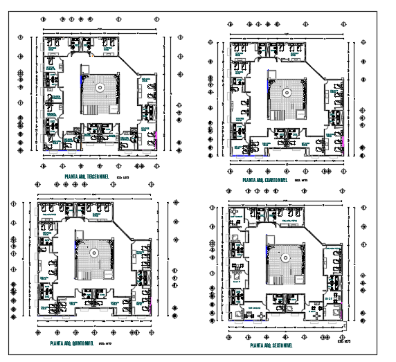 Plan of hotels showing detailed layout plan of all floors of the hotel with placing furniture in each room like bed tv sitting area with dimensions.