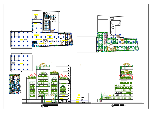Plan of Hotel with interior plan and exterior elevation of the hotel showing entrance windows doors in exterior elevation dome shaped top of the building and also basement parking details. with required dimensions.