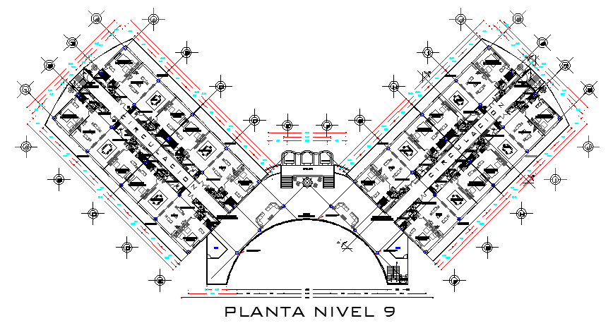 Layout plan of hotel drawing dwg file that includes entry lobby, garden, car parking reception, cafeteria, gym, party hall, conference hall, administration office, corridor, dinning area, waiting area, sitting area, kitchen, restaurant, toilets, bedrooms and much more of hotel design.