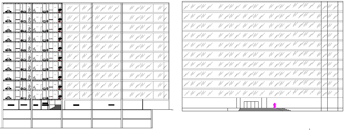 The Architecture Design of Hotel Elevation that includes detailed view of entry gate, doors and window elevation, stair case, entry lobby, garden, car parking reception, cafeteria, gym, party hall, conference hall, administration office, corridor, dinning area, waiting area, sitting area, kitchen, restaurant, toilets, bedrooms and much more of hotel design.