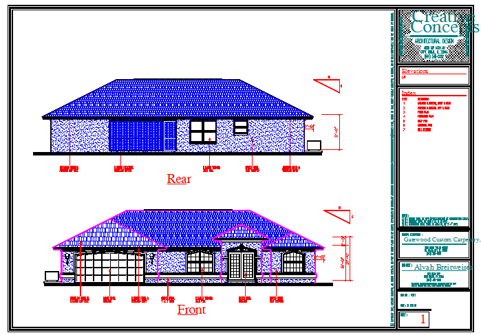 Rear & Front Side Elevation design in autocad file include, & all detail like level window & door, fiberglass shingles aluminum drip edge.