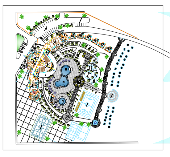 Layout plan of hotel near beach showing entrance lobby water flow area greenery rest room reception casino gymnasium children play area bungalow.
