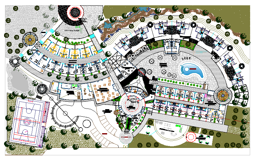 Layout plan of hotel with all details like swimming pool entrance lobby reception hall staircase lift block rest rooms with toilet and also rooms for stay with bed sofa tv and layout shows greenery around the hotel.