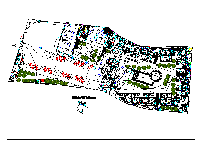 Layoutplan of hotel with all details like swimming pool entrance lobby reception hall staircase lift block rest rooms with toilet and also rooms for stay with bed sofa tv and layout shows greenery around the hotel.