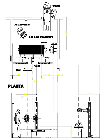 X-Ray Room of Hospital Elevation that includes command cabin, room of examination, pb viewfinder, circulation, entry gate, exam equipment and much more of examination hall.