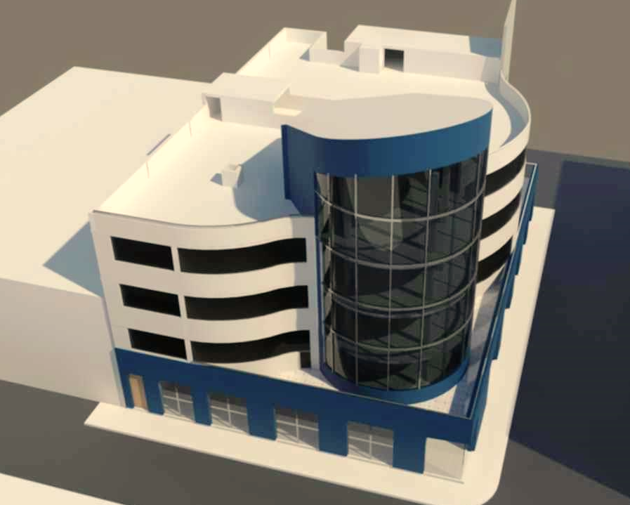 3D Corporate Office AutoCAD DWG with Rendered Building Elevation