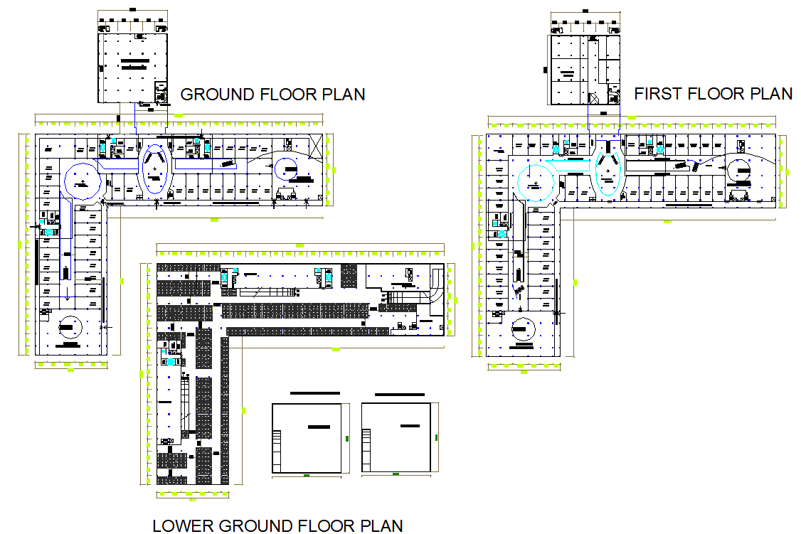 The Shopping Mall AutoCAD DWG drawing presents a detailed multi-level commercial layout that includes lower ground, ground, and first-floor plans. The design displays well-organized retail spaces, corridors, rest zones, and vertical circulation systems, including elevators and staircases. The lower ground floor highlights parking and service zones, while the upper levels show boutique stores, central atriums, and wide corridors ensuring smooth foot traffic movement. The CAD drawing also includes detailed annotations for shop placement, restrooms, and administrative areas, making it a perfect layout for medium and large-scale mall developments.
