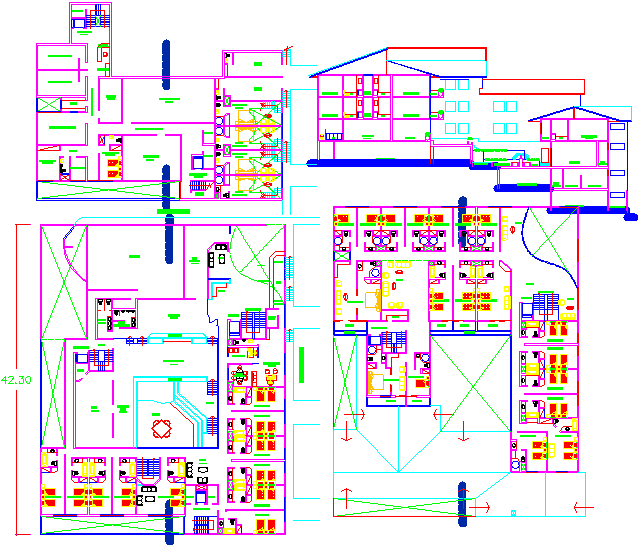 Preliminary Hotel and elevation design dwg autocad file with hall,reception,washing area, staircase in elevation, reception,seating area.