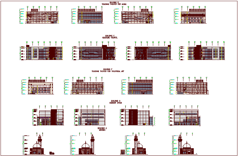 Government individual building dwg file with view of building view with teaching theater,common space and mosque view with entry way,level view and necessary