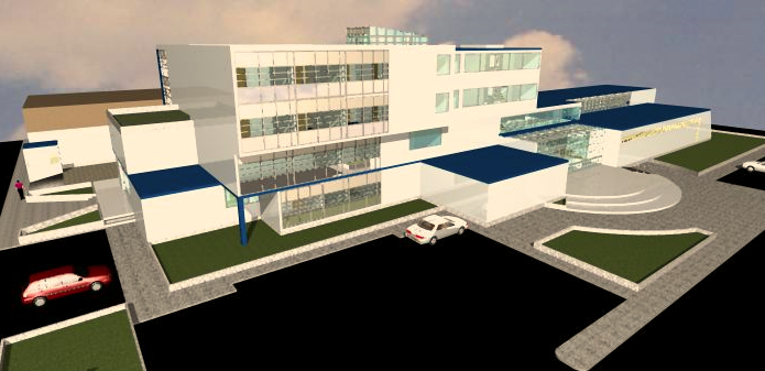 The Cardiology Clinic AutoCAD DWG drawing provides a detailed architectural design featuring a 3D rendered exterior view of a modern healthcare facility. The layout demonstrates well-planned spatial organization, including patient reception areas, consultation rooms, laboratories, administrative offices, and emergency zones. The design emphasizes accessibility, ventilation, and circulation efficiency across multiple floors. The front façade showcases a clean, contemporary look with glass and concrete elements, while the site plan integrates parking zones, landscaped pathways, and entrance driveways for smooth vehicular movement.