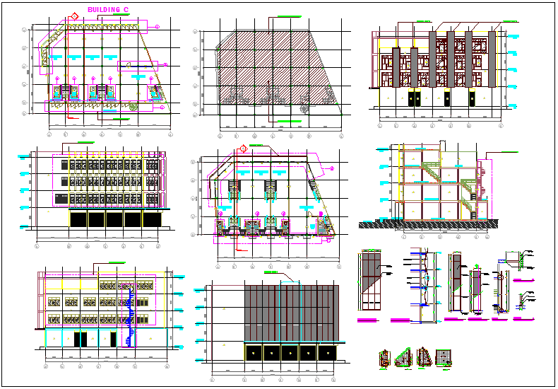 Column detail view of plan and elevation view of building dwg file with view of plan and elevation view of building with necessary dimension,floor view and floor level and column view in design of plan of building with detail view.
