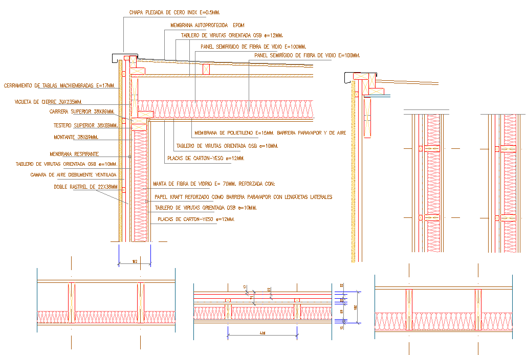 This AutoCAD Wooden Door DWG file offers a complete set of sectional construction details for architectural and interior projects. The drawing illustrates frame joints, fiber insulation layers, door panel composition, and wall section connections. Each segment includes precise material specifications such as OSB panels, gypsum boards, polyethylene membranes, and wooden framing elements. The plan showcases accurate dimensions, providing clarity on installation depth, fixing points, and reinforcement alignment, ensuring high precision during on-site execution.