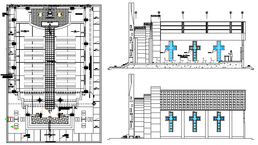 Church Architecture Design and Plan dwg file . Church Architecture Design and Plan that includes front and back elevations, side view, wall construction, elevation plan, walking path, entry lobby, prayer hall with chair, hall of uses, garden area and much more of church design.