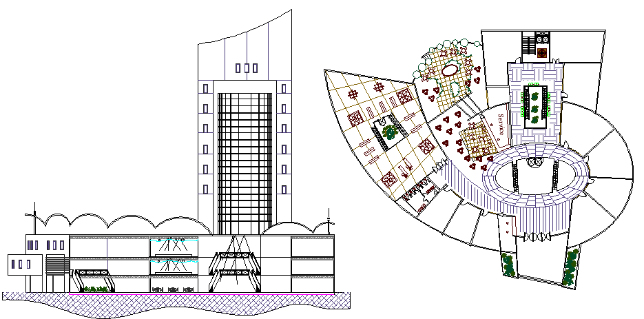The Architecture Layout of Commercial Building that includes front and back elevations, tower plan, ground floor plan, first and second floor plan, terrace,garden, gate, offices, reception area, lobby, stair case, service area, dinning area and much more of commercial building.