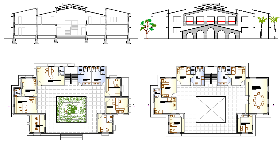 Beach Resort Elevation Plan and Design that includes front elevation, back elevation, side elevation, garden, main entrance, staff entrance, wide road, office, car parking, administration, swimming pool, resort building, cottages and much more of resort design.