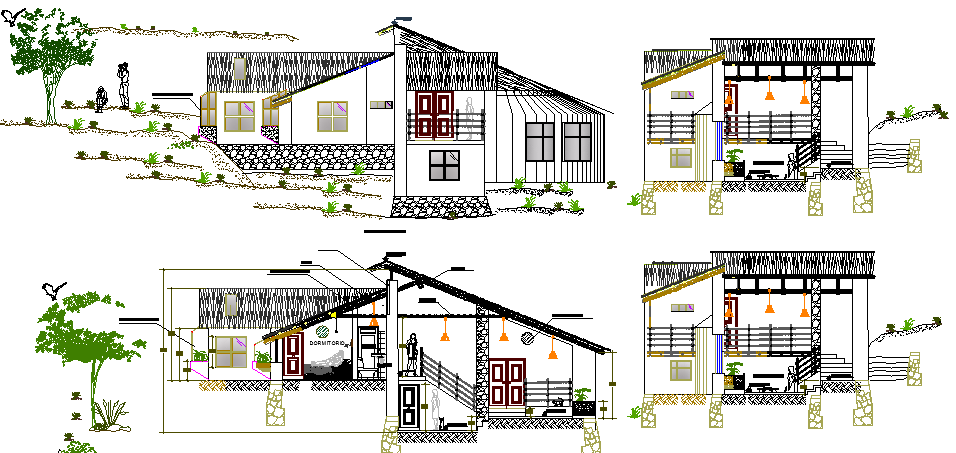 Resort Design and Elevation Plan that includes front elevation, top elevation, back elevation, section details, entry door, garden, swimming pool, gym, kitchen, aerobics, spinning, bedrooms, waiting lounge, reception area, car parking, cafeteria, restaurant and much more of resort design.