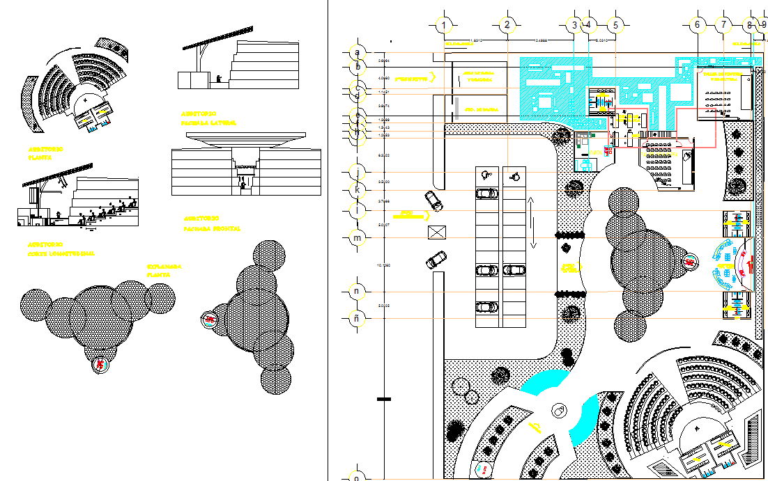 Culture Center AutoCAD DWG with Auditorium, Sections, and Site Layout