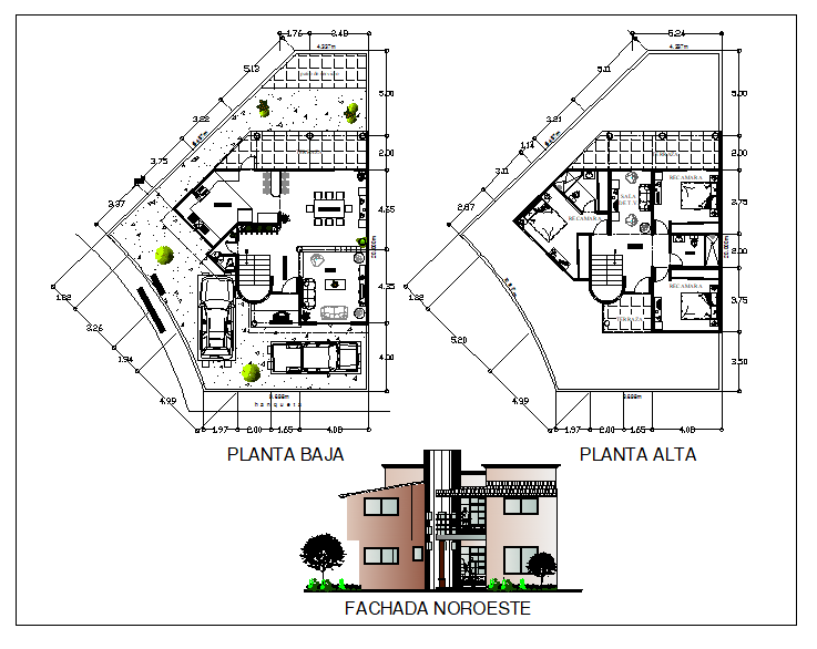 Floor plan and exterior elevation of a bungalow showing foor plan showing living room dining kitchen bed room terrace and exterior elevation showing entrance gate balcony garden windows sloping roof parapet parking with dimensions.