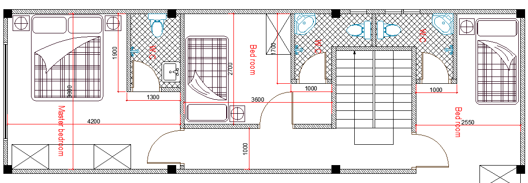 Two Story Residential Flats Elevation Design that includes front elevation, back and side elevations, construction details, stair case details, house plan including master bedroom, bedrooms, toilet and bathroom, kitchen and much more of flats design.