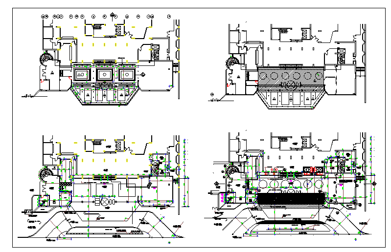 Floor plan and Exterior elevation of Restaurant floor plan showing dining area waiting area bar area kitchen toilet and exterior elevation showing parking and design of the building with dimensins.