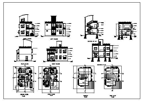 Floor plan of bungalow with ground plus one floor showing entrance living room dining kitchen toilet parking and also placing of furniture in the house with all measurements.