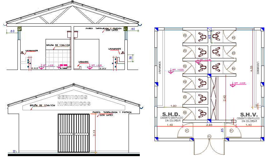 Architecture Plan of Hygienic Service Elevation that includes front elevation, doors and windows electric installation, toilet construction, wall construction, column and beam details and much more of toilet design.