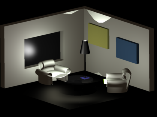This 3D living room CAD drawing provides a beautifully detailed interior visualization with a realistic rendered view, showcasing modern furniture and lighting arrangements. The layout features two elegant armchairs, a central coffee table, wall-mounted artworks, and ambient lighting effects that enhance the aesthetics of the space. The rendering captures both the texture and spatial arrangement of the interior, making it an excellent reference for architects and interior designers working on residential or commercial projects.