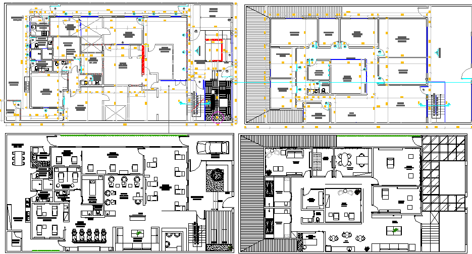 Commercial Building Design and Elevation that includes layout plan details, architecture details, electric fitting details, hydraulic details, flooring details, landscaping details, plaster details, office cabin details and much more of building design.