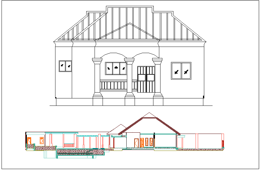Director building front elevation and section view dwg file with view of front elevation view with designer door and entry way and sectional view with door,window,column and concrete view in section.