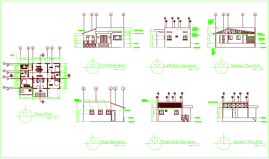 Residential area floor plan,front elevation and sectional view dwg file with view of