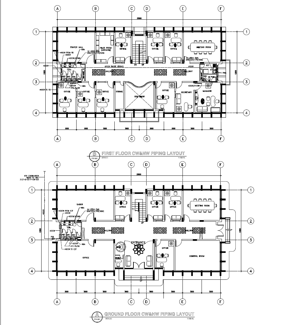 Piping Layout plan detail pdf file. Find here the ground floor piping layout plan and first-floor piping layout plan and furniture detailing in pdf file.