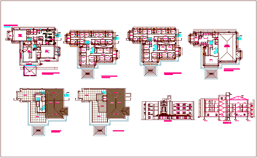 with view of hotel and resort floor plan with ground to fourt floor plan,elevation and section view with view of entry way.lobby,restaurant,washing area,banquet hall, in plan